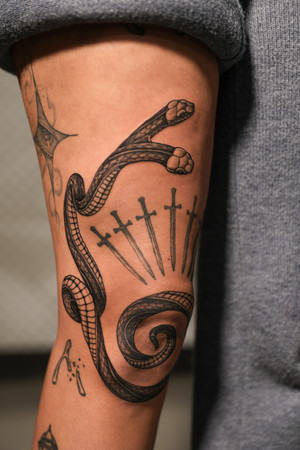 This double-headed snake tattoo by our artist @the_rat_tattoo couldn’t have been more fitting for October. Twisting around the knee with a hypnotic spiral, it's eerie and bold features capture everything we love about the darker side of tattoo art.