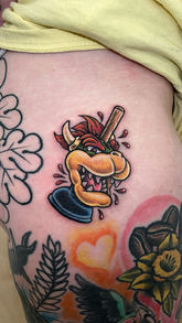 Raised on comics, video games, and cartoons, I’ve been drawing on friends since grade school. After studying graphic design and working in illustration, lettering, and printmaking, it became clear tattooing was always the goal. Since finding a mentor in 2017, I’ve focused on creating meaningful, collaborative tattoos—especially nerdy, nostalgic ones.